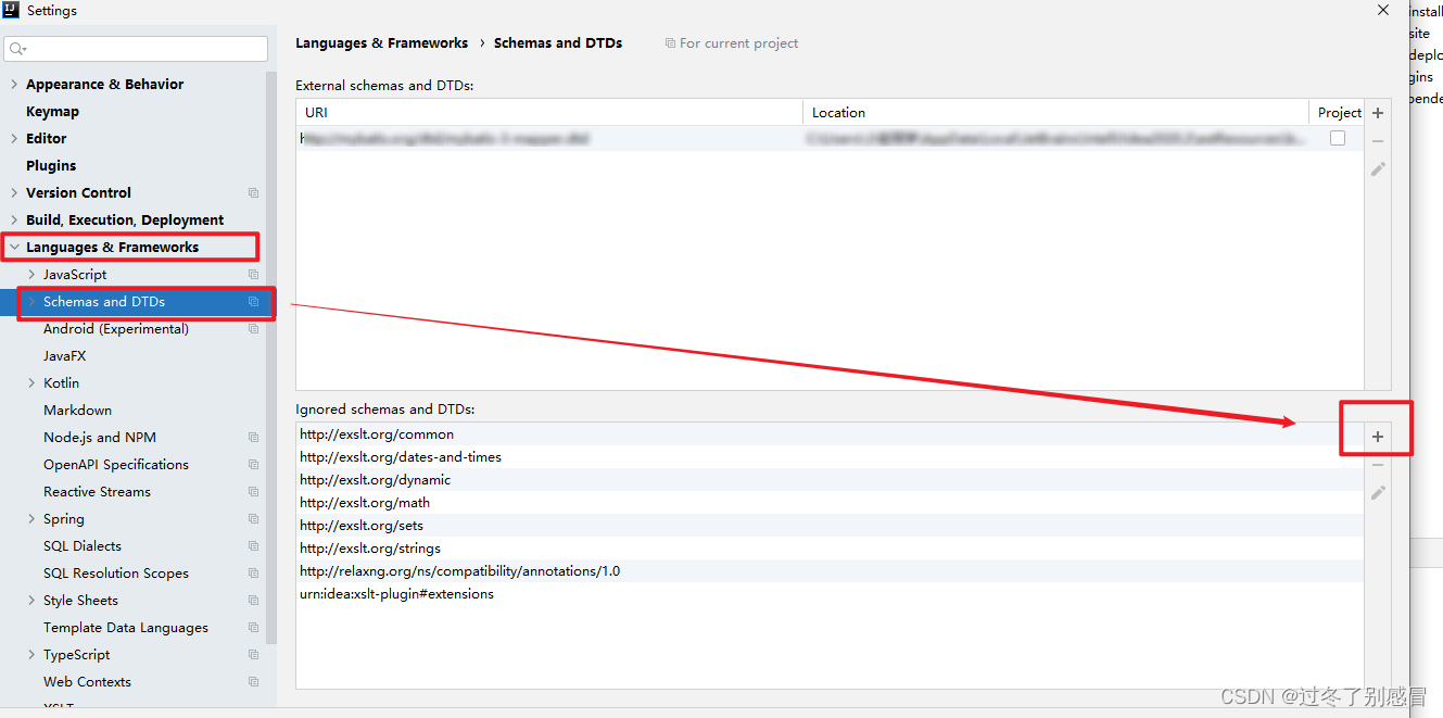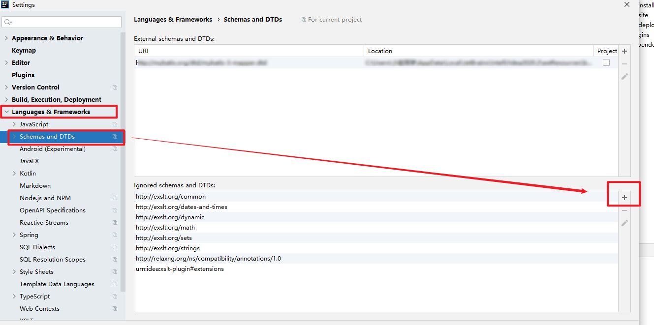 - file --> settings- -> languages & frameworks -->Schemas and DTDs,