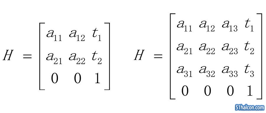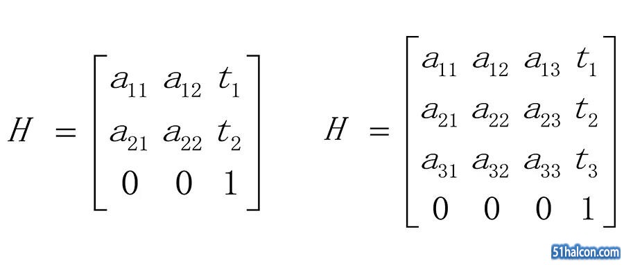 注:线性变换不包含平移,所以没有归入几何变换,总之HALCON中常用几何变换是仿射和投影变换,而相似变换是仿射变换的一种简单情况!相似变换、仿射变换、投影变换既可以发生在二维空间内也可发生在三维空间内。