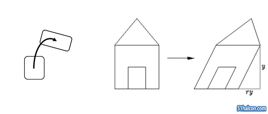对于仿射变换,有两个比较特殊的变换:非等比例缩放和切变(如下图),除了这两个特殊的变换之外,相似变换可以看做是仿射变换的特殊形式,注:线性变换包括旋转、缩放、切变,但不包含平移,因此仿射变换也定义为一个线性变换再加上一个平移变换。