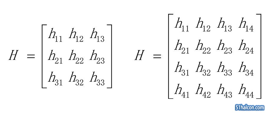 投影变换的定义:变换过程中,直线映射为直线(但不一定保证平行度),任何二维投影变换都可以用3x3可逆矩阵表示,而任何三维投影变换都可以用4x4可逆矩阵表示。如下: