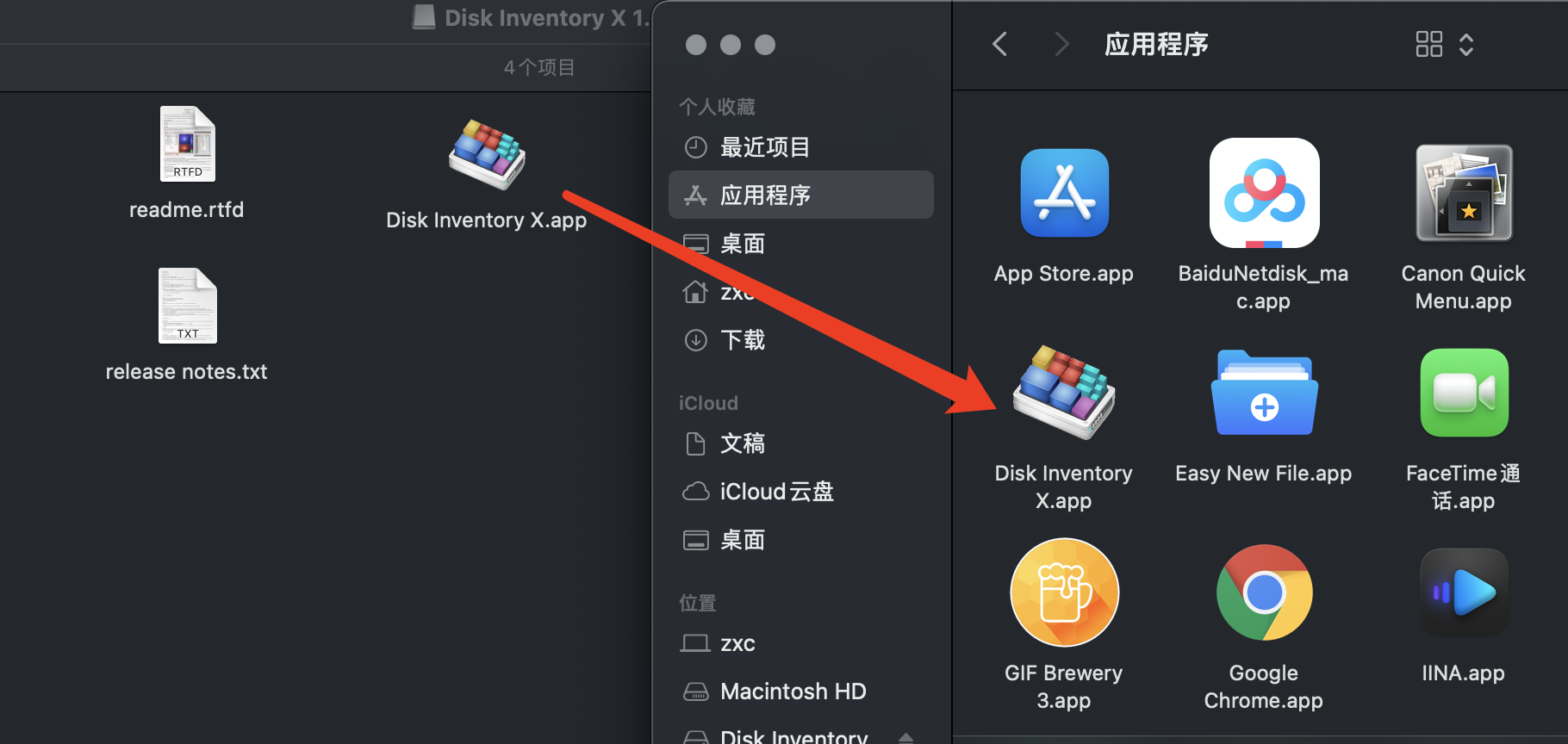 Disk Inventory X下载后,将Disk Inventory X.app拖放到应用程序下