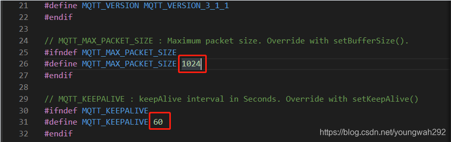 无论是在哪个目录下,要修改的内容都是相同的。找到PubSubClient.h头文件,然后编辑。找到MQTT_MAX_PACKET_SIZE,将256修改为1024,再找到MQTT_KEEPALIVE,将15修改为60。