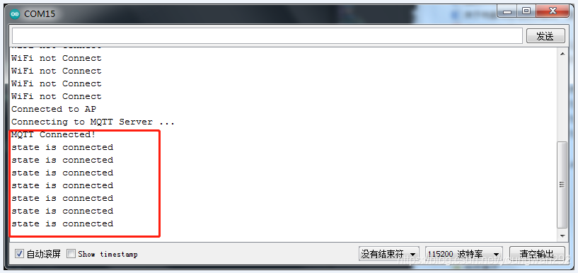打开arduino自带的串口监视器(用其他串口调试终端也可以),D1自动初始化,然后开始找wifi,连接wifi成功之后,MQTT就连接上了。