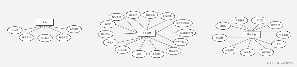 通过对会议管理系统的功能进行规划,分成会议室实体、会议信息实体、用户实体等多个实体信息,实体信息通过ER图进行说明,本系统的部分实体图如下: