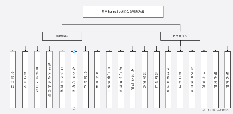 主要功能有:会议室管理、会议预约、审批、签到、会议参会通知、会议日程管理、公告管理、用户管理等功能