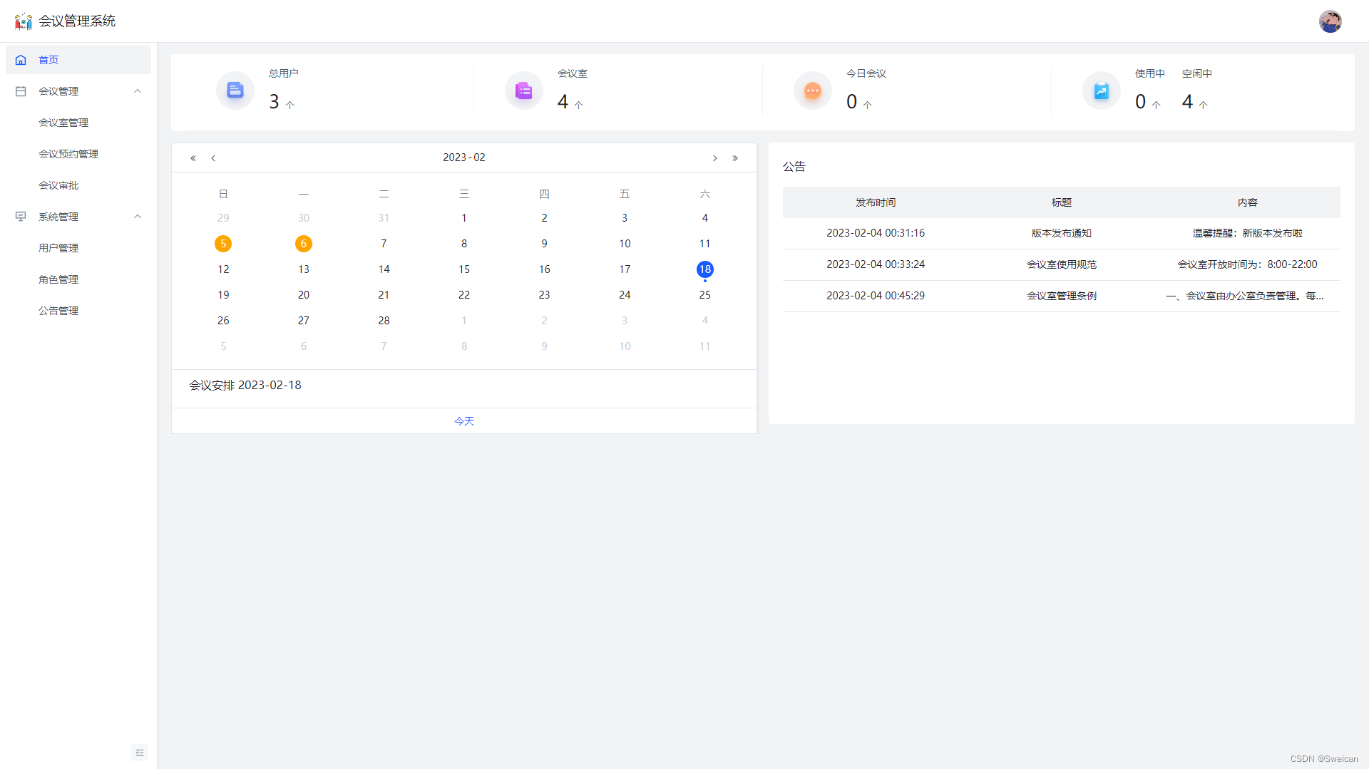 会议管理员:可进行会议室管理、会议预约审批、会议数据统计、会议室日程管理、会议信息管理、邮件通知、系统用户及角色管理、系统公告管理等