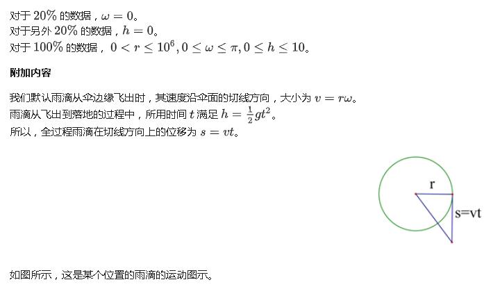 Marser 记录下了雨伞旋转的角速度w(单位为 rad·s-1),半径r(单位为 m),以及雨伞边缘离地高度 h(单位为 m)。他要求你计算封闭图形的面积,其中,重力加速度 g 取 10 m·s-2。