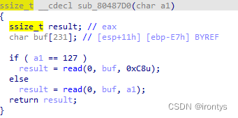 s的值a1,为main函数中输入的随机数,v1的值为srrlen(buf),当buf第一位为\0时,v5=0,strcmp因为比较长度为0,所以在判断长度内,没有不相等的字符串,于是函数返回值为输入字符串的第八个字节。在下一个函数里,该数字决定了可输入字符串的最大长度,于是将其设置为255。(P32(255)的意义等同于 ff 00 00 00(小端序), 和\xff是一个意思)