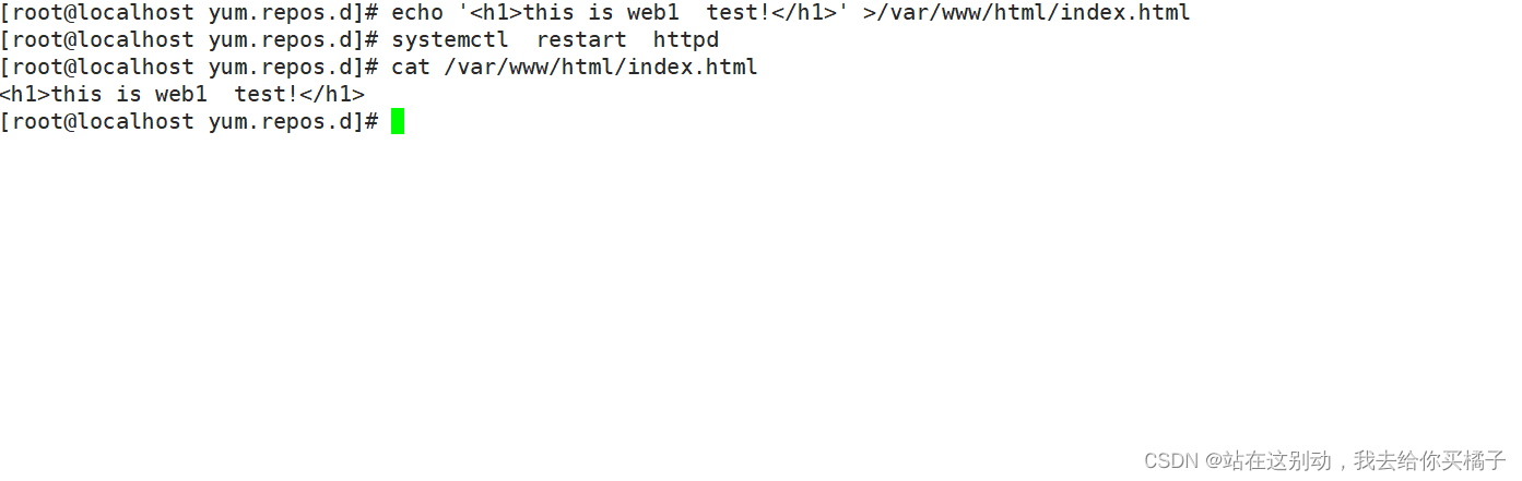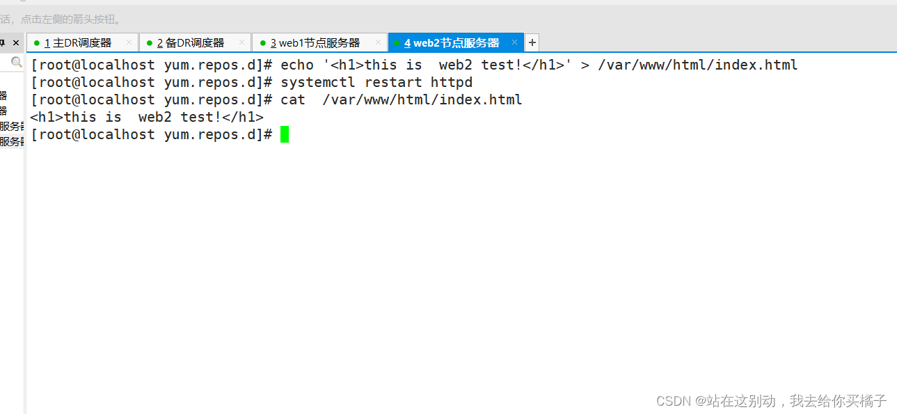 (1)安装httpd服务,并且创建各自的测试网页(真实环境是多个节点服务器挂同一个NFS共享机,并且内容网页相同。)