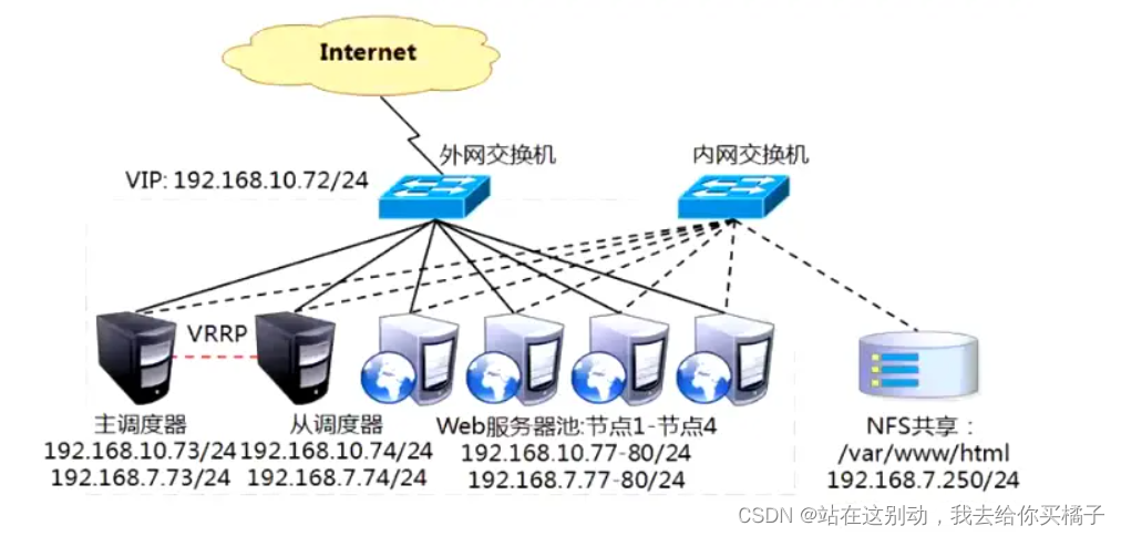 普通的群集的部署是通过一台度器控制调配多台节点服务器进行业务请求的处理,但是仅仅是一台调度器,就会存在极大的单点故障风险,当该调度器的链路或则调度器本身出现故障时,就会导致整个业务的无法正常进行。