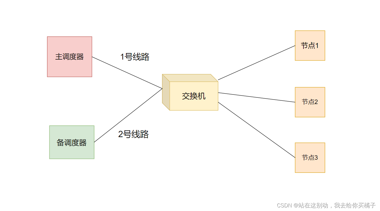 (2)采用条件判断语句,若主调调度器ping不通备调度器时,主调度器启用ssh服务远程借用节点服务器对备用调度器进行ping命令(可以多设置几台节点服务器ping,确保准确性)。若节点服务能ping通则说明问题出现在1号线路,主调度器进行自我裁决,让备调度器进行主调调度器的工作。若节点服务器也ping不通备调度器,说明问题出在了2号线路。