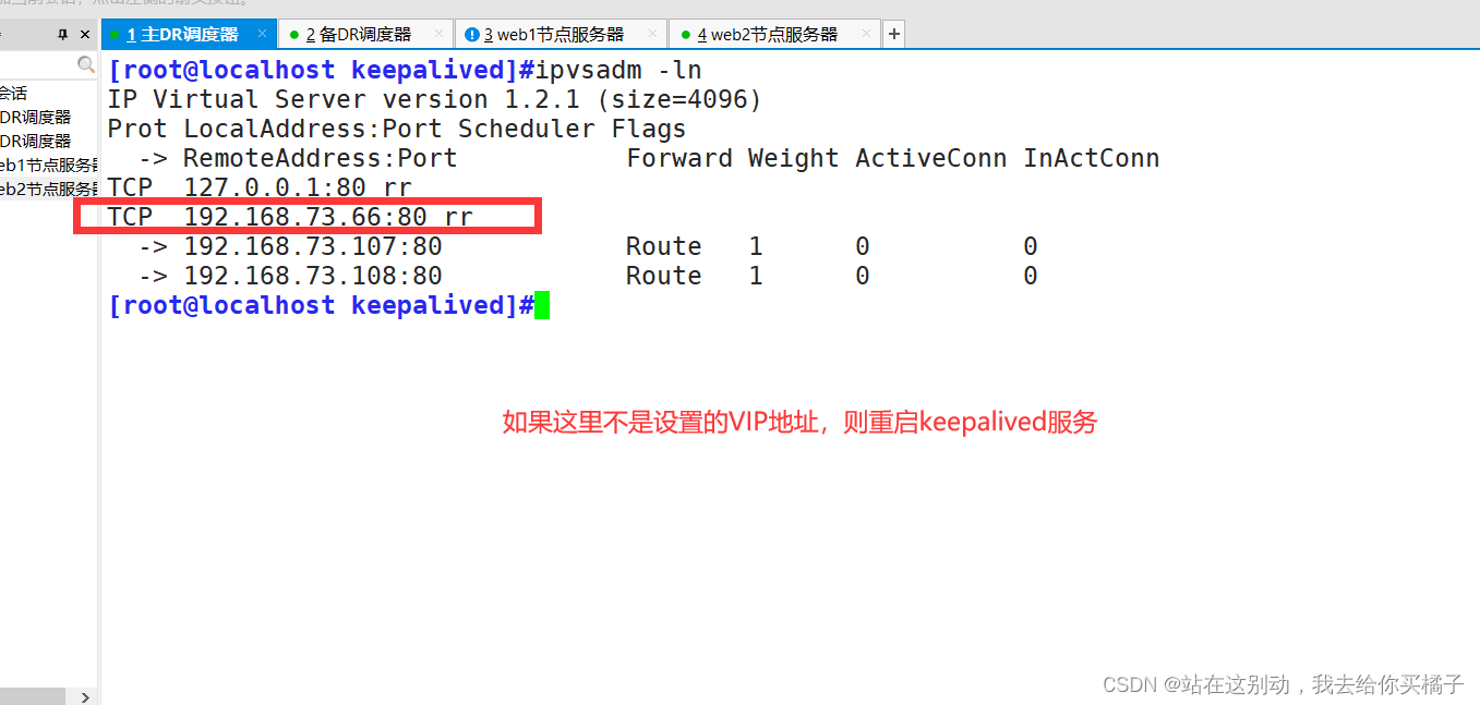 --45行--删除,添加以下健康检查方式 TCP_CHECK {connect_port 80 #添加检查的目标端口connect_timeout 3 #添加连接超时(秒)nb_get_retry 3 #添加重试次数delay_before_retry 3 #添加重试间隔}}real_server 192.168.73.108 80 { #添加第二个 Web节点的地址、端口weight 1TCP_CHECK {connect_port 80connect_timeout 3nb_get_retry 3delay_before_retry 3}}
