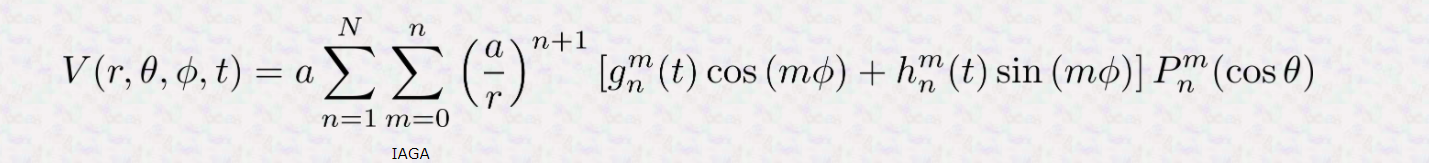 在地球表面及以上的无源区域,主场(源位于地球内部)是标量势V的负梯度,可以用截断的级数展开表示: