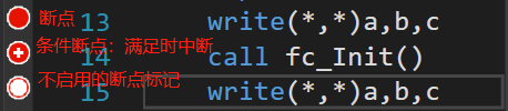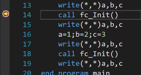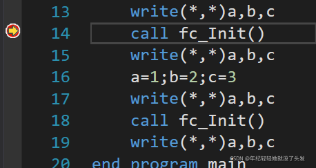 - 点击行号前添加红色断点,一般在主程序声明语句结束后的第一个执行语句添加断点,开始调试F5,来启动调试界面。