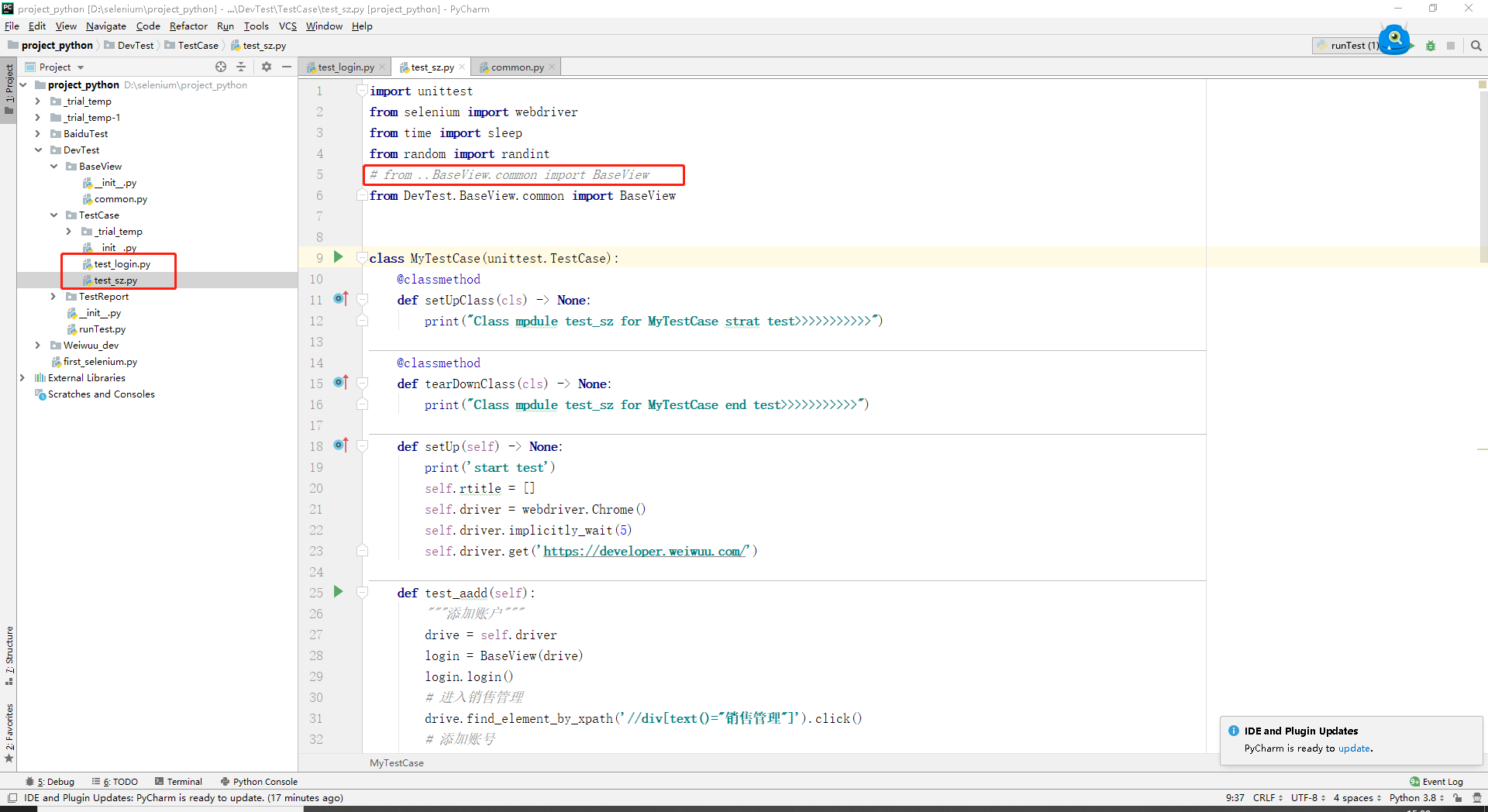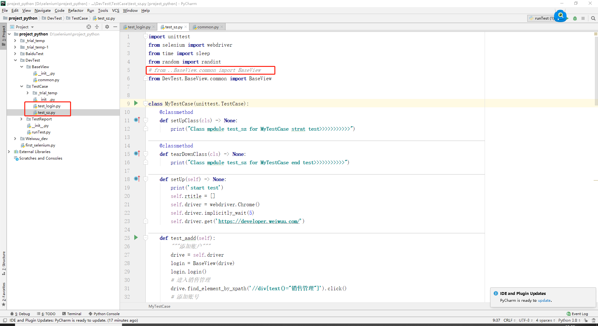 我TestCase文件夹下面有两个test_*.py文件,其中一个我通过from …BaseView.common import BaseView的方式从其他的文件夹导入了公共模块的方法。在我通过这种方法导入文件后,去runTest文件运行时,发现这个文件不会被运行: