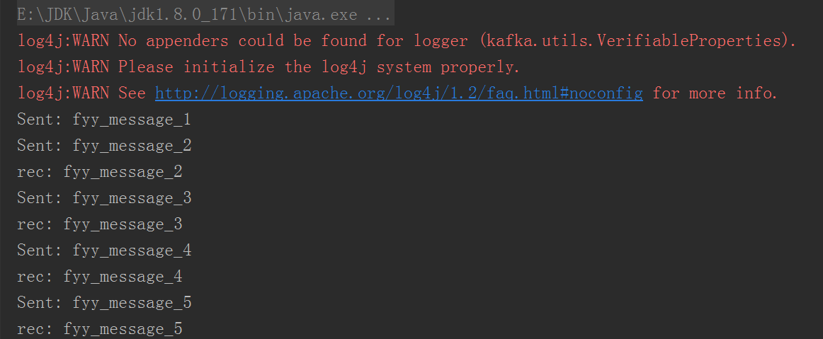 public class KafkaTesttApp {public static void main(String[] args) {// 生产者new KafkaProducer(KafkaProperties.TOPIC).start();// 消费者new KafkaConsumer(KafkaProperties.TOPIC).start();}