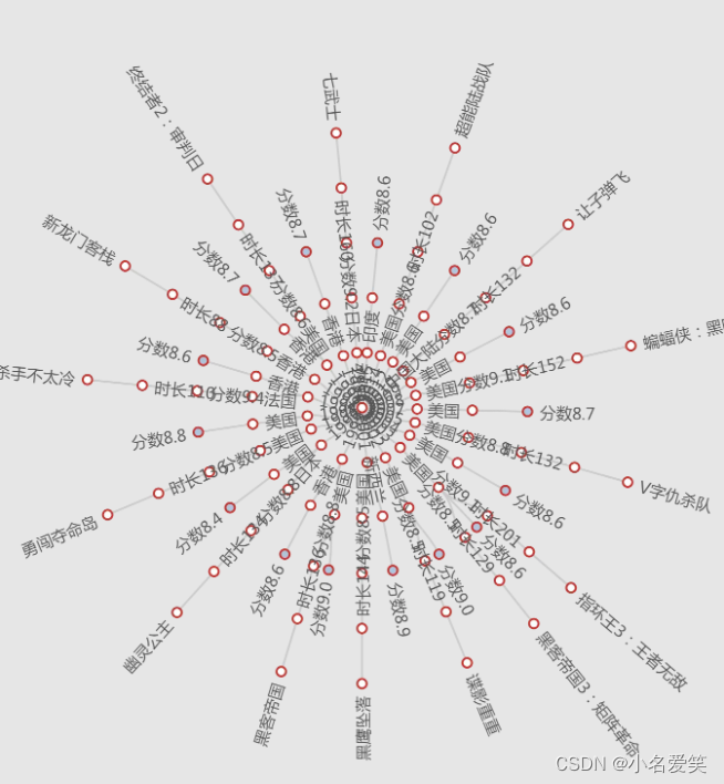 def getAgeScoreJson():ageScoreMap = {}ageScoreMap['ages'] = ['Growth']ageScoreMap['ageNames'] = []sql = r'select DISTINCT age from movie ORDER BY age desc'ageList = getPureList(getJsonData(sql))# print(ageList)for age in ageList:avgScoreList = []for type in typeNameList:sql = r"select avg(score) from movie where age = '{}' and type like '%{}%'".format(age, type)avgScore = str(getPureList(getJsonData(sql))).strip("['").strip("']")if avgScore == 'None':avgScore = 0avgScoreList.append(round(float(avgScore)))ageScoreMap[str(age)] = avgScoreListageScoreMap['ages'].append(str(age))# ageScoreMap['ageNames'].append('result.type' + str(age))ageScoreMap['names'] = typeNameListreturn ageScoreMapdef writeAgeScoreJsonFile(path):with open(path, 'w') as f:json.dump(getAgeScoreJson(), f)writeAgeScoreJsonFile(r'C:\Users\Administrator\Desktop\books\movieAgeScoreJson.txt') - 前端页面