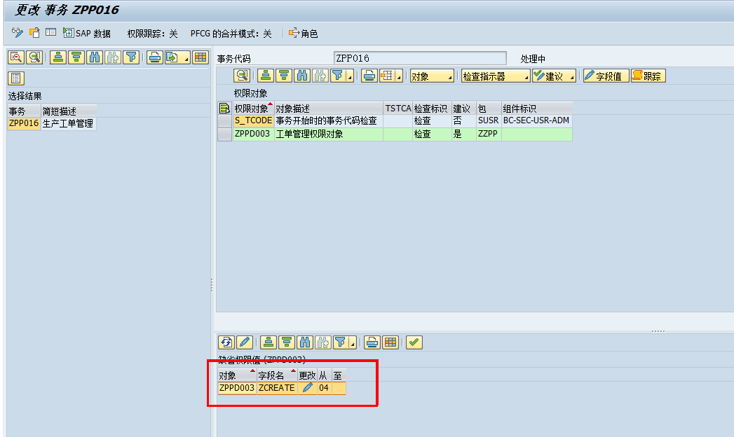 IF r1 = 'X' OR r2 = 'X'.AUTHORITY-CHECK OBJECT 'ZPPD003'ID 'ZCREATE' FIELD '04'.IF sy-subrc = 0.MESSAGE e398(00) WITH '你没有创建和修改工单的权限!'.ENDIF.ENDIF.