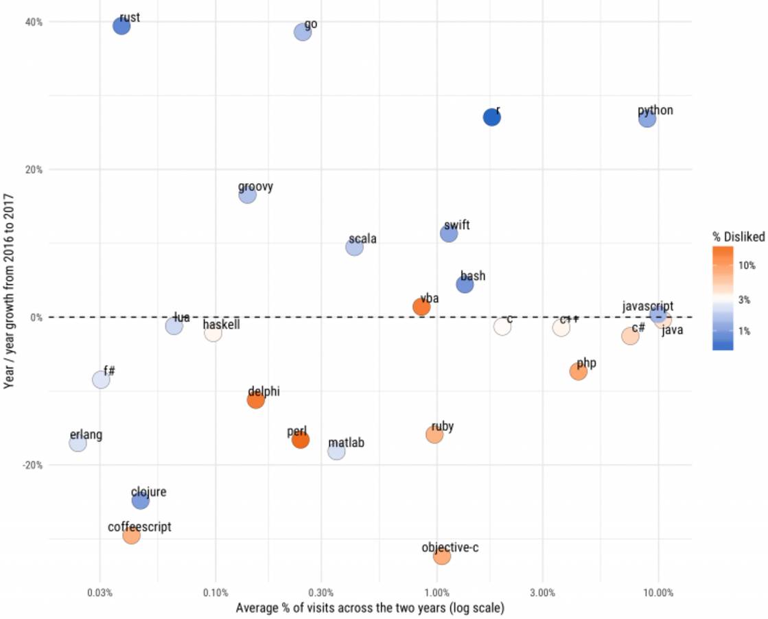 下面我们可以通过比较每种语言的增长与标记“dislike”的百分比来验证以上观点,橙色点表示最不受欢迎的语言。为了使分析和后面的观点一致,我们将统计数据限制在高收入国家(如美国,英国,德国和加拿大)。
