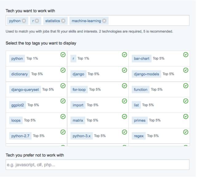在 Stack Overflow 中,你可以创建一个自己的“ Developer Story”,记录个人项目开发经验相关的内容。假如要创建一个“ Developer Story”,你需要选择添加一些标签,比如你最喜欢的语言或最不喜欢的工作等。如下:
