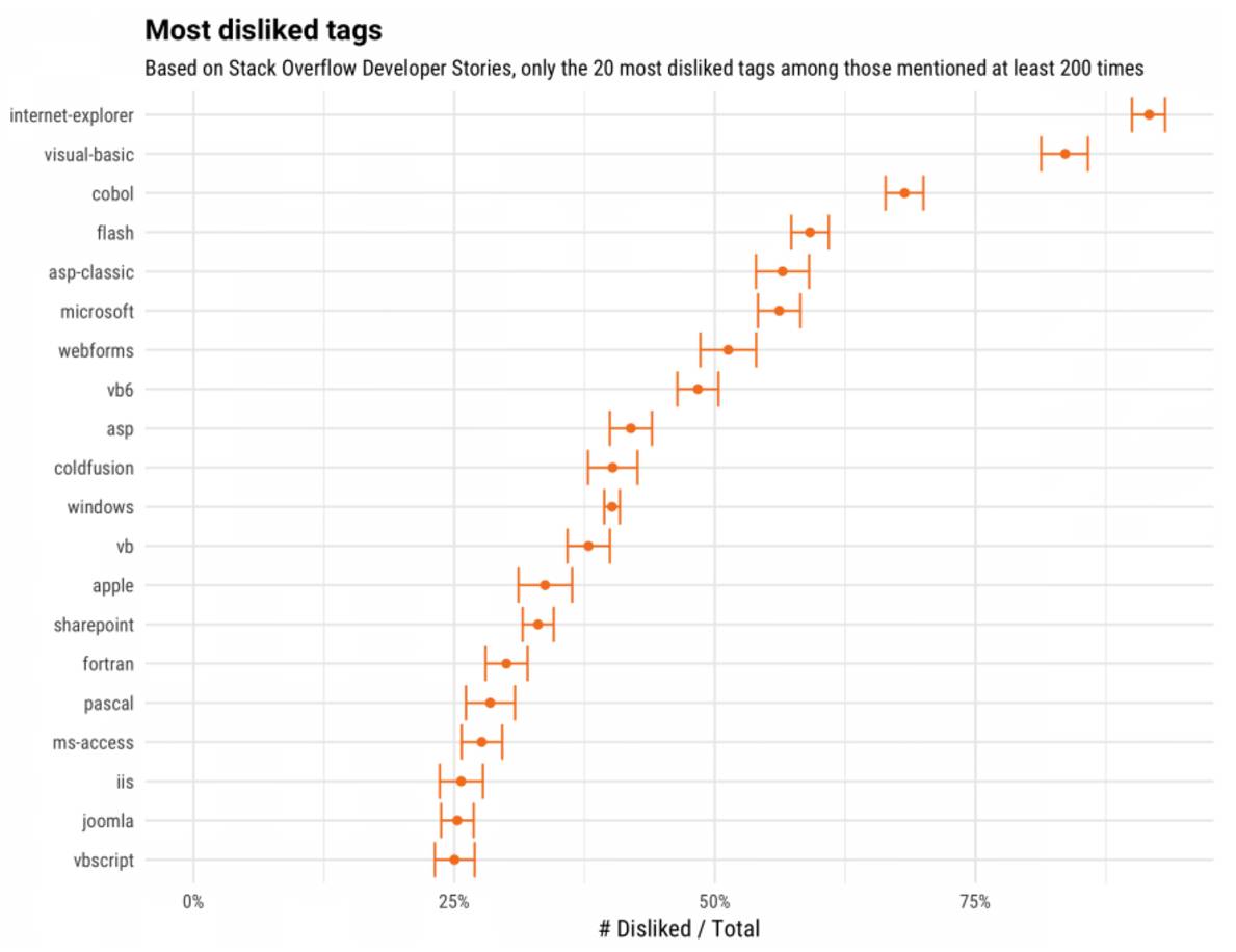 上述分析仅考虑编程语言,而不是操作系统,平台或库。那什么是开发者最不喜欢的技术?