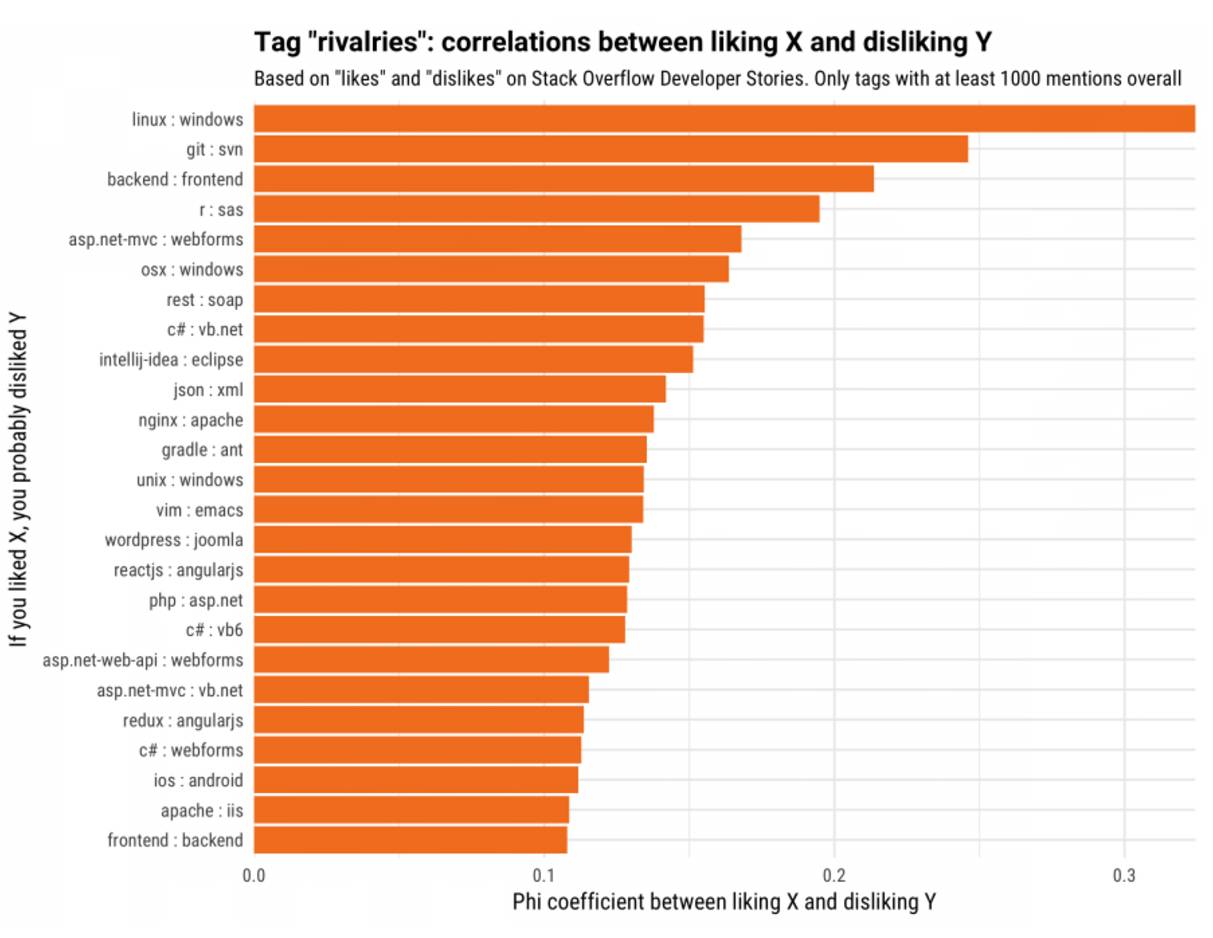 有趣的是,数据还体现了行业中存在的技术型竞争关系,像是 Linux 、OSX vs Windows,Git vs SVN,vim vs emacs ,React vs Angular 等。开发人员通常不愿意使用他们认为过时的东西,建议用更现代的技术来取代。