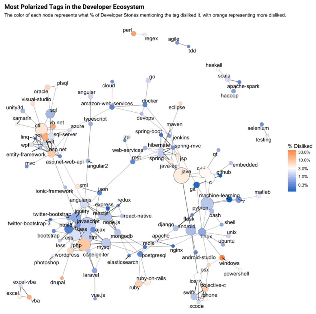 通过将“Developer Story”标签设置为子生态系统,微软(以C # 和 .Net 为中心)、PHP(WordPress 和 Drupal 为中心)以及移动开发(特别是 Objective-C)的子生态系统中存在标签集群。操作系统的集群(右下),我们可以看到诸如 OSX 和 Windows 被标记为“dislike”,但 Linux、Ubuntu 和 Unix 这样的标签就没有被标记。