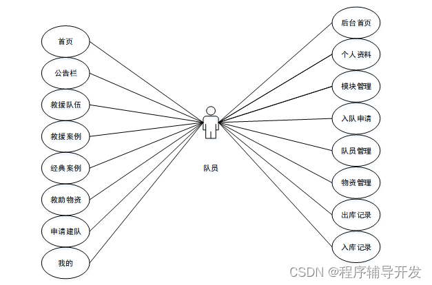 民间应急救援队管理系统中队员角色功能包含了登录、公告栏、救援队伍、救援案例、经典案例、救助物资、申请建队、我的(我的账户、我的收藏、个人中心)后台首页、个人资料(个人信息、修改密码)、模块管理(入队申请、队员管理、物资管理、出库记录、入库记录、物资募捐、离队申请、申请建队),队员的用例图如图2.1所示: