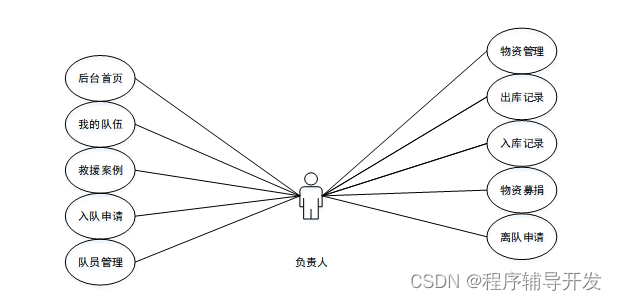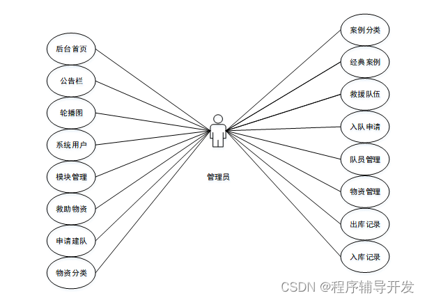 民间应急救援队管理系统中管理员角色功能包含了登录、轮播图、公告栏管理、系统用户(平台管理者、队员、负责人、管理员)模块管理(物资分类、案例分类、救援队伍、经典案例、救助物资、申请建队、救援案例、物资募捐、离队申请、入队申请、队员管理、物资管理、出库记录、入库记录)等功能,管理员的用例图如图2.2所示:
