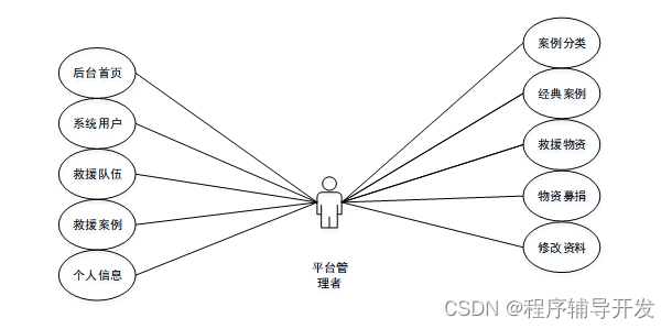 民间应急救援队管理系统中平台管理者角色功能包含了登录系统用户(队员、负责人)模块管理(案例分类、救援队伍、经典案例、救助物资、申请建队、救援案例、物资募捐)等功能,平台管理者的用例图如图2.3所示: