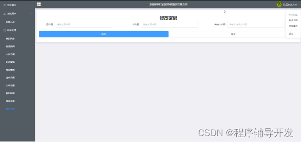 (12)修改密码:负责人点击“修改密码”按钮,可以对登录密码进行更改,首先输入原密码,然后再输入新密码和确认密码,当原密码正确,输入两次新密码一致,则修改成功,否则给出错误提示信息。