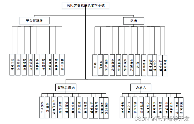 民间应急救援队管理系统的开发主要是解决双手,提高效率,为企业的发展进行添砖加瓦,所以在系统的功能方面我们首先要从企业管理的角度进行,然后再从员工的角度进行,确保能够满足每个用户的需求,因此在功能上主要规划了企业的管理员以及员工两部分,实现了登录、管理员、队员、平台管理者、负责人、队员管理、物资管理这几大功能。