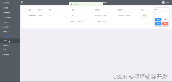 (4)平台管理者:管理员点击“系统用户”菜单下单“平台管理者”按钮可以查看到救援队的所有平台管理者,如果想要填写新的平台管理者,点击右侧的“添加”按钮,然后输入账号、密码、昵称、手机号码、邮箱等信息,点击“提交”按钮进行提交,同时也支持对已有的平台管理者进行编辑、删除和查询;