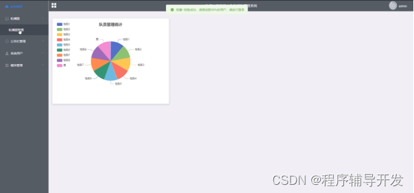 (2)首页:管理员等会成功以后会在首页界面以分析图的形式查看到系统中的队员管理信息统计;
