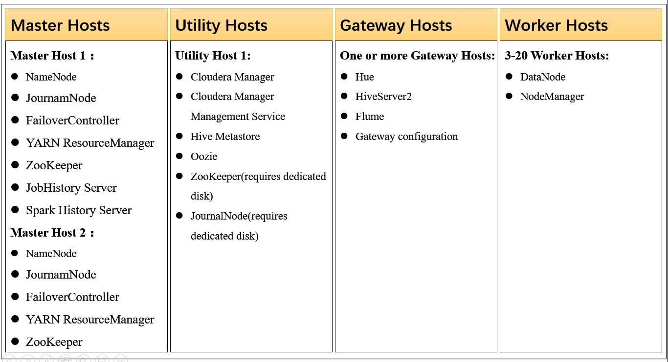 - Utility节点安装其他组件的主服务,如Hive Metastor、Oozie等;Cloudera Manger也安装在Utility节点上,Cloudera Manager占用的资源相对较大,在集群规模较小时刻安排在Utility上与其他服务共享,以后随着规模扩展,也可考虑将其迁移到单独节点上。