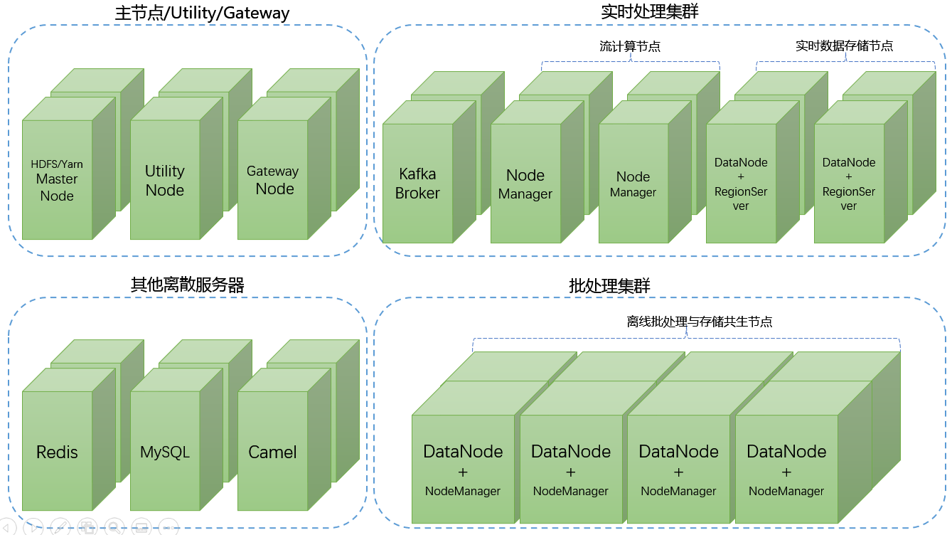 - 其次,流计算节点上只需要安装NodeManager,不需要安装DataNode,因为流计算节点只负责计算,不存储数据,在进行流计算时不存在数据存储与计算资源的“共生”问题,但批处理集群上,NodeManager一定要和DataNode共生。