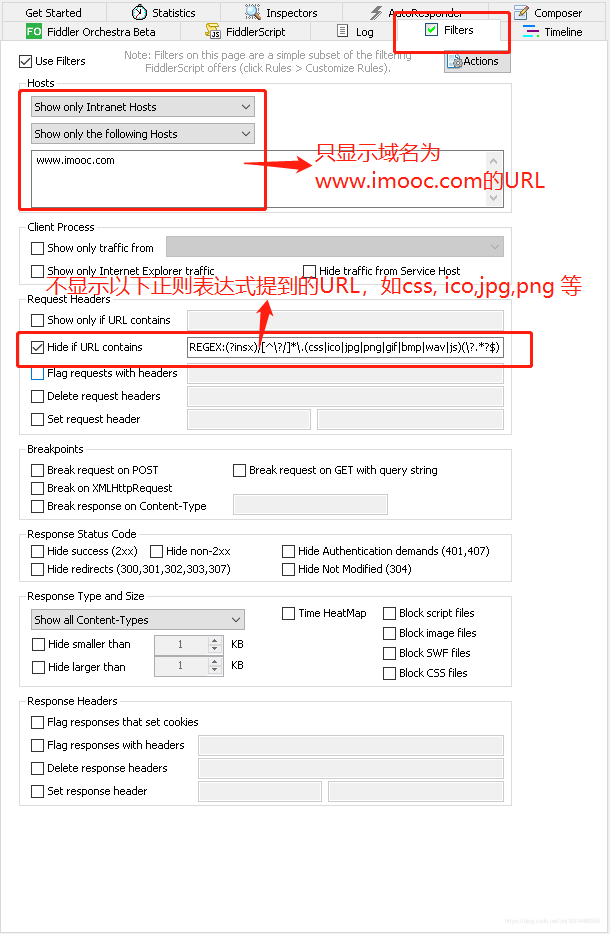 上图中可看到返回来一大堆的请求内容,各种类型的都有,但这并不是我们想要的内容,接下来就介绍下Fiddler的过滤–Filters功能:
