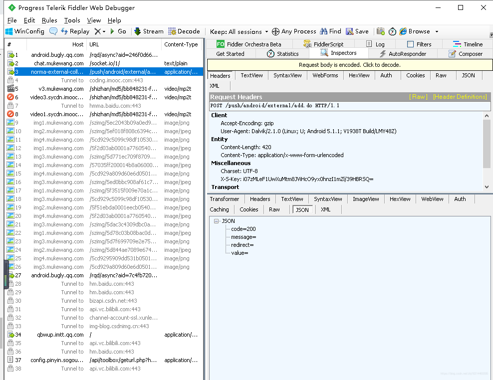 然后在模拟器上面启动慕课网APP,我们就可以看到Fiddler里面抓取到了一些慕课网相关的请求,如下图: