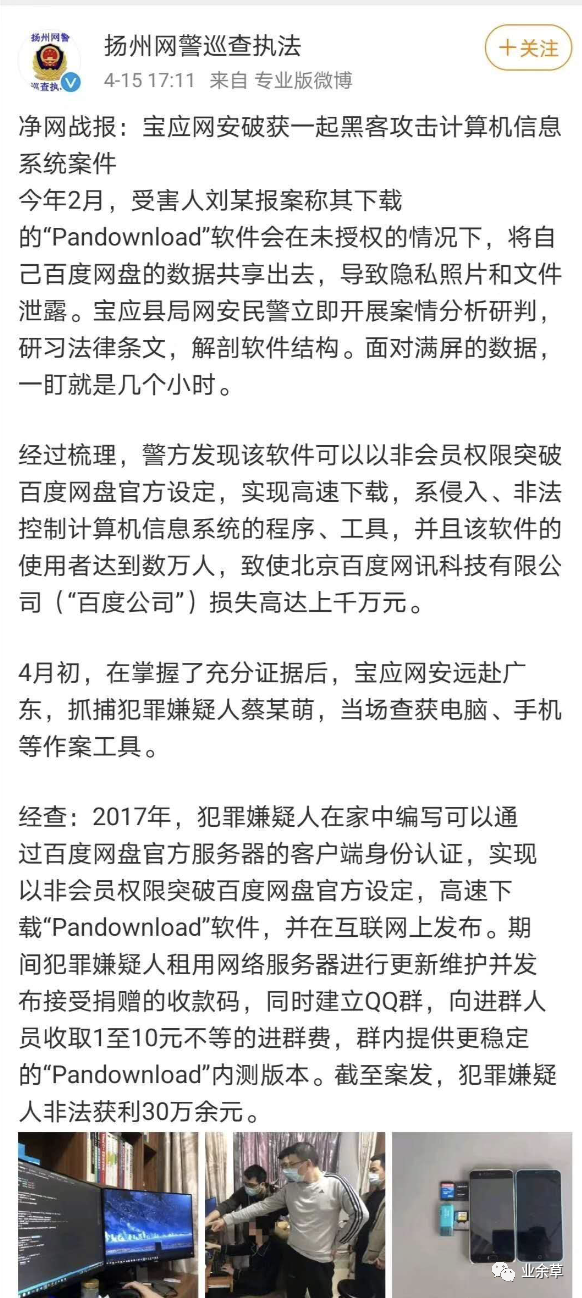 网安发现该软件可以以非会员权限突破百度网盘官方设定,实现高速下载。应该是动了百度的奶酪,杀鸡吓猴。