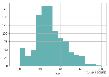 age = df['age'].hist(bins=15, color='teal', alpha=0.6)