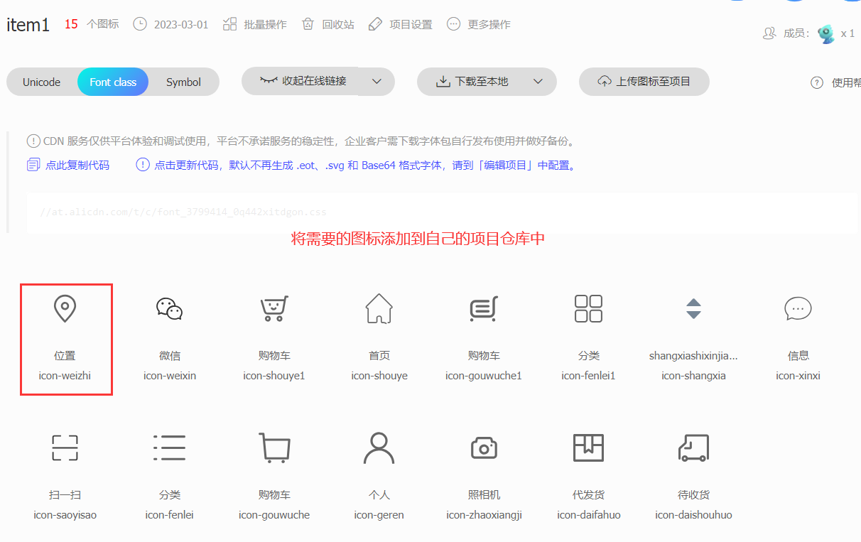 说明:i标签中的类名一定要添加,而且是要加两个类名,第一个类名是固定的(可以在阿里图标库中修改,但不建议修改用默认的就好了),第二个类名就是你需要用到的图标名称