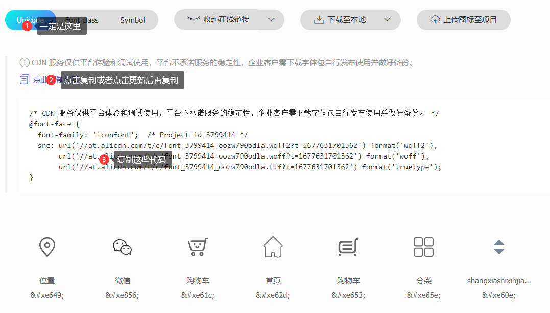 说明:引入第三方图标在线引入是在阿里图标中复制图标路径