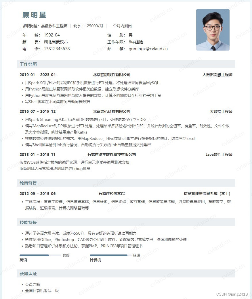 作为示例,这份简历来自一名有六年工作经验的高级Java软件工程师,他擅长大数据处理和Java开发,曾就职于北京联想软件有限公司和北京维伦科技有限公司,参与过多个项目的编码、测试和维护。他通过了英语六级考试和全国计算机考试一级,掌握项目管理知识和证书。