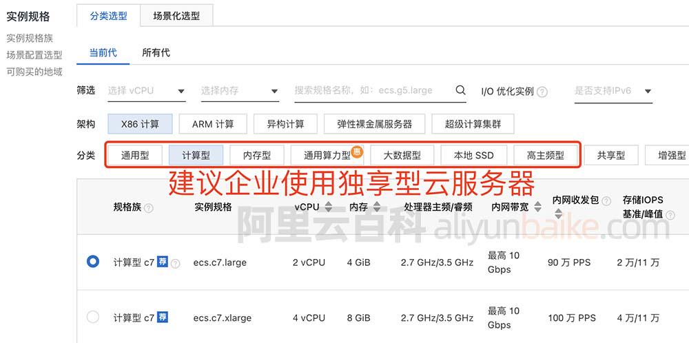 企业用户生产环境对于云服务器CPU计算性能要求较高,ECS规格建议选择企业级独享型,如ECS计算型c7、通用型g6、内存型、大数据型、本地SSD、高主频型或GPU实例等,共享型云服务器如ECS共享型s6、、共享型n4、突发性能t5或t6等不建议选择。如下图: