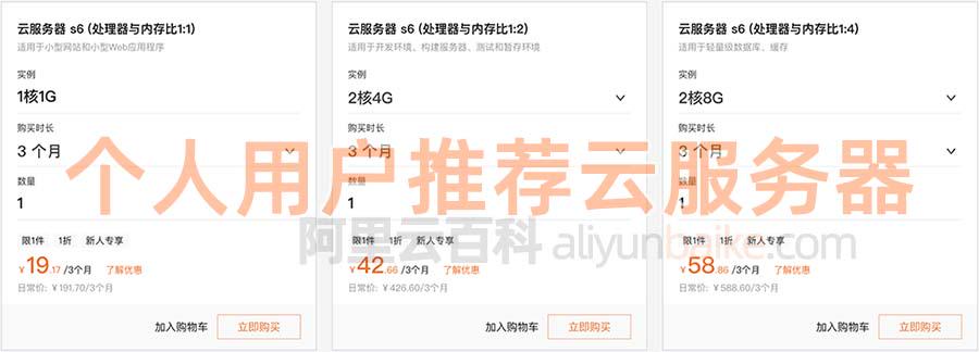 个人使用选择ECS共享型s6实例就可以了。另外共享型云服务器,不只是s6,还有ECS共享型n4实例、突发性能t5或t6实例,突发性能是限制CPU基准性能的,阿里云百科不建议选择,共享型n4实例是上一代共享型云服务器,同CPU内存配置下性能不如s6云服务器,当前的共享型s6云服务器性价比更高,建议个人用户选择。