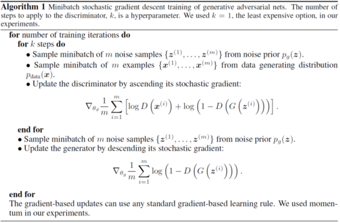 这里红框圈出的部分是我们要额外注意的。第一步我们训练D,D是希望V(G, D)越大越好,所以是加上梯度(ascending)。第二步训练G时,V(G, D)越小越好,所以是减去梯度(descending)。整个训练过程交替进行。