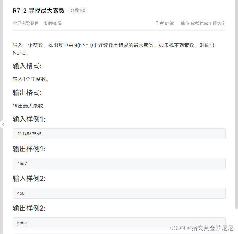 {string s1;int changdu = 0, max = 0, length = 0, temp;vectora;vectora1;cin >> s1;for (int i = 0;i < s1.size();i++)//把字符串各数字存入到数组中{a.push_back(s1[i] - '0');changdu++;}for (int i = 0;i < changdu; i++)//控制起始位置{temp = 0;for (int j = 0;j < changdu - i; j++)//从起始位置一直累次往后推{temp = temp * 10 + a[i + j];if (zhaosushu(temp))//把素数存起来{a1.push_back(temp);length++;}}}if (length == 0)//判断是否有素数{cout << "None";}else{for (int i = 0;i < length;i++)//找最大素数{if (a1[i] > max){max = a1[i];}}cout << max;}return 0;