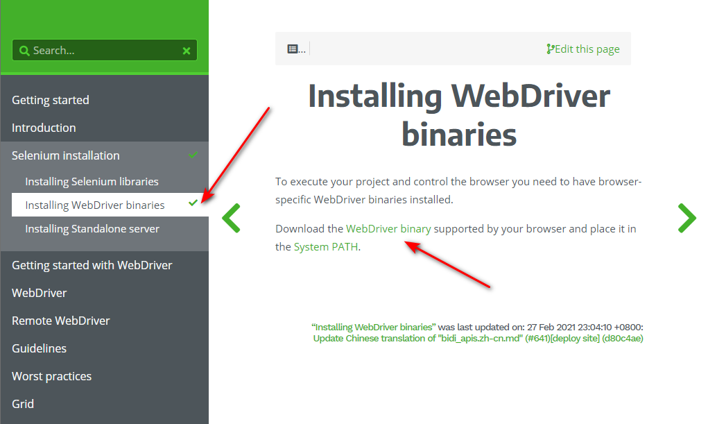 2.左侧目录选择 Selenium installation-->Installing Webdriver Binaries
