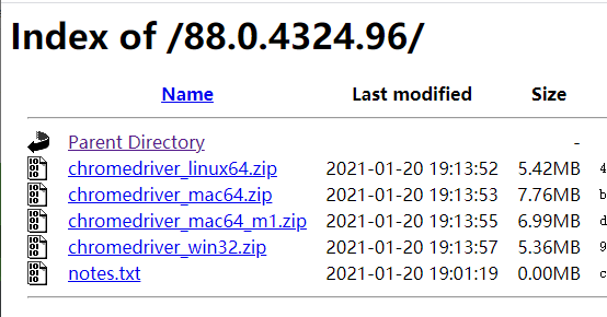 点击WebDriver binary 进入,滑动到版本参考比对页面,按照浏览器版本,点击对应的下载链接,下载对应平台的驱动文件,此实例中,chrome版本是88.0.4324.190,所以,选择版本为88.0.4324.96(大版本必须匹配,小版本尽量接近,简单来说,从左到右,一次比对,下载与版本号最接近的文件),然后再根据平台的不同,下载不同的文件即可,这里下载的是windows平台的zip文件。