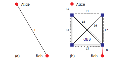 在QBB内,链路可以串联级联以连接更远距离的用户,并且并行地获得更高的安全密钥率值。 图1.b示出了用户Alice和Bob与对应链路LA和LB连接到QBB的密钥请求的情况。 这里链路L5并联连接到由L1和L2形成的链路,而另一个链路连接到L3和L4。 假设每个QKD设备具有固定成本,则可以根据两个节点之间的单链路距离来寻找总体成本的最优值。 对于许多先进的QKD系统,对于一维链路以及二维网络,相应的最佳距离约为25 km。这也是SECOQC演示器中的平均距离。